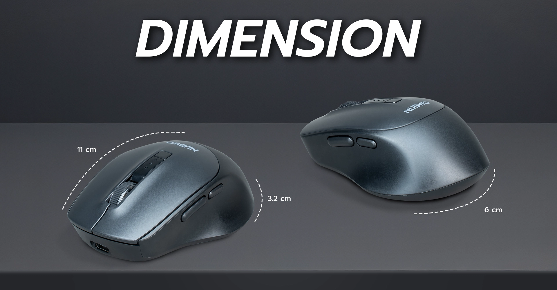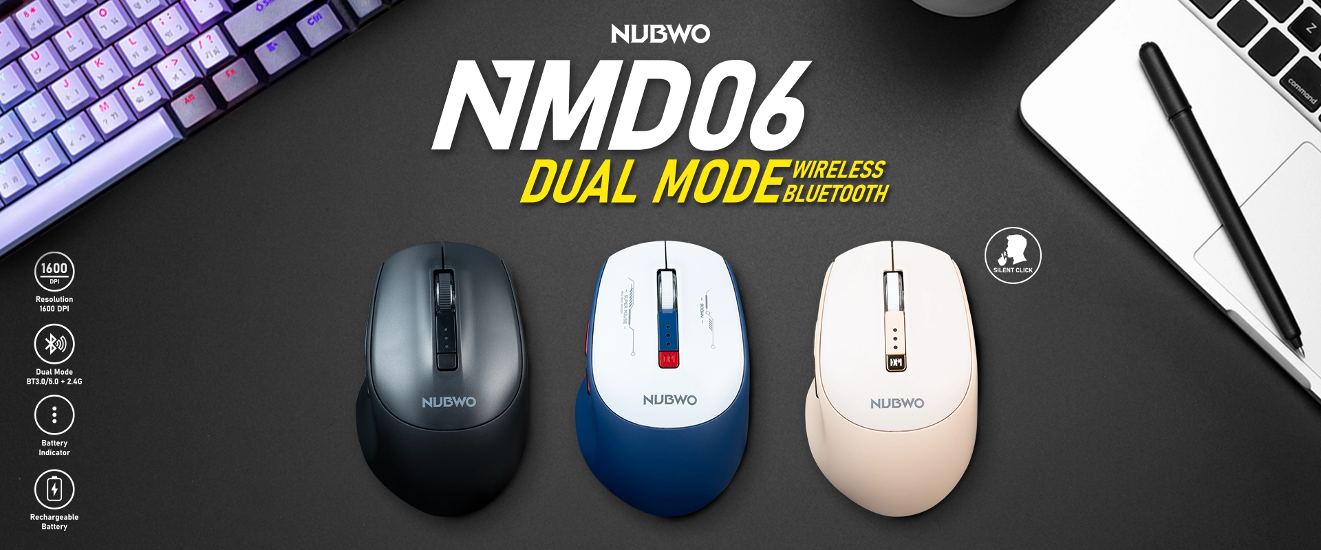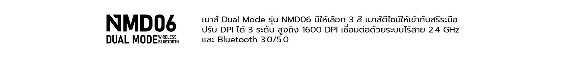เมาส์ไร้สาย รุ่น NMD06 มีทั้งหมด 3 สี มีปุ่มควบคุมการทำงานถึง 6 ปุ่ม เพื่อการใช้งานที่ลื่นไหล พร้อมระบบเชื่อมต่อแบบ Dual Mode Wireless 2.4 GHz & Bluetooth 3.0/5.0 ระยะเวลาในการชาร์จไฟ 2.5 ชั่วโมง มีสถานะไฟ เมื่อแบตชาร์จเต็มไฟสีแดงจะดับไป สามารถปรับ DPI ได้ 3 ระดับ และความละเอียดสูงสุด 1600 DPI