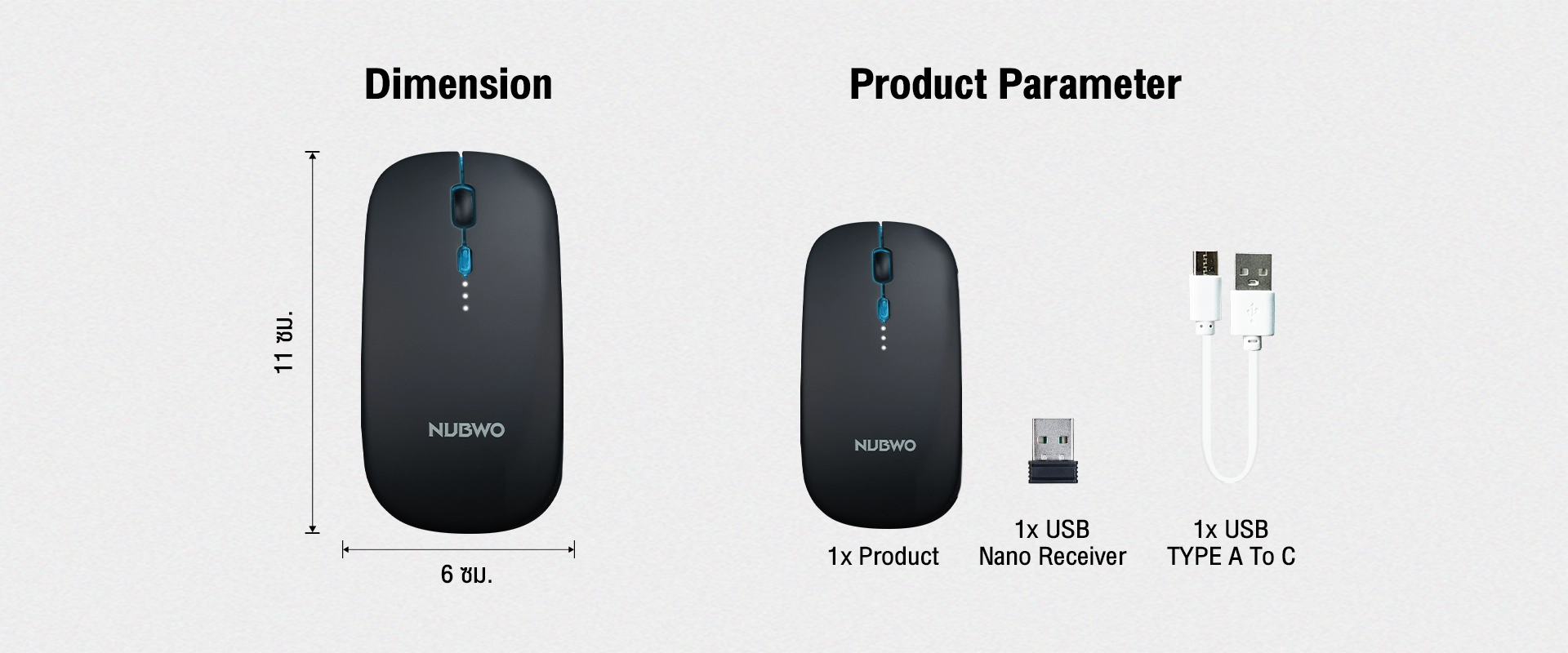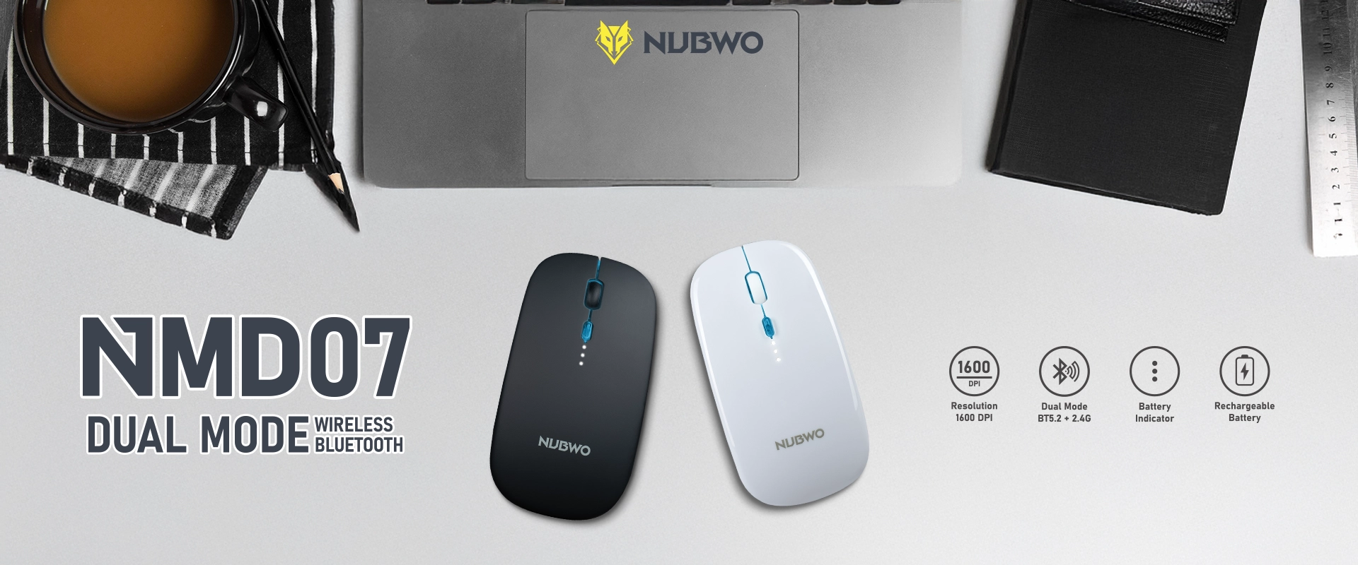 เมาส์ไร้สาย รุ่น NMD07 มีทั้งหมด 2 สี ระบบเชื่อมต่อแบบ Dual Mode Wireless 2.4 GHz & Bluetooth 5.2 แบตเตอรี่ขนาด 500mAh ระยะเวลาในการชาร์จไฟ 2-3 ชั่วโมง มีสถานะไฟบอกเมื่อมีการชาร์จแบต สามารถปรับ DPI ได้ความละเอียดสูงสุด 1600 DPI ไร้เสียงรบกวนด้วยระบบ Silent Click