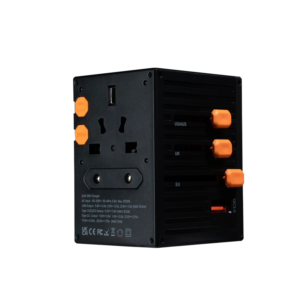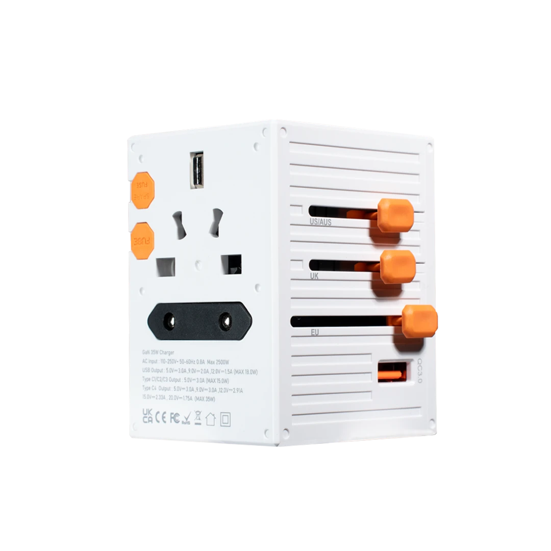 หัวแปลงปลั๊กไฟต่างประเทศมาพร้อมเทคโนโลยี GaN (Gallium Nitride) ที่ช่วยให้การใช้งานมีประสิทธิภาพ ปลอดภัยมีพอร์ต Type-C ที่รองรับกำลังไฟสูงสุด 35W (ช่อง USB Type-C 4ช่อง และ USB 1 ช่อง) มาพร้อมขาปลั๊ก 3 แบบ AC Input 100-250V รองรับการใช้งานได้มากกว่า 150 ประเทศ ยุโรป อเมริกา แอฟริกา เอเชียและตะวันออกกลาง ฯลฯ วัสดุกันไฟ ได้มาตรฐานและปลอดภัย