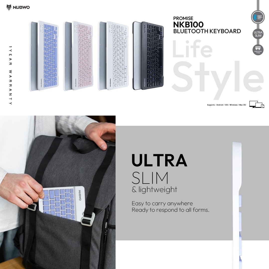คีย์บอร์ดไร้สาย รุ่น NKB100 แป้นพิมพ์ที่ไร้เสียงรบกวน มาพร้อมการสัมผัสที่ยอดเยี่ยมและแม่นยำ น้ำหนักเบา พกพาสะดวกไปได้ทุกที่ ใช้งานง่ายเพียงปลายนิ้ว ผ่านระบบบลูทูธ ที่สามารถเชื่อมต่อได้พร้อมกัน 3 เครื่อง กับเทคโนโลยีที่รองรับระบบ iOS Android Windows และ Mac OS เพลิดเพลินกับการใช้งานที่หลากหลาย คุ้มค่าคุ้มราคา