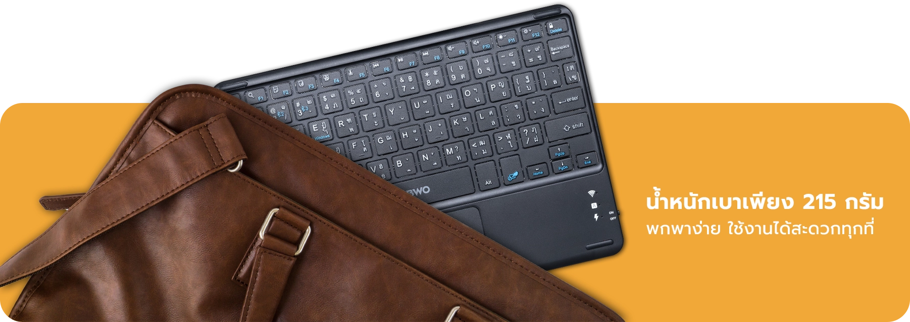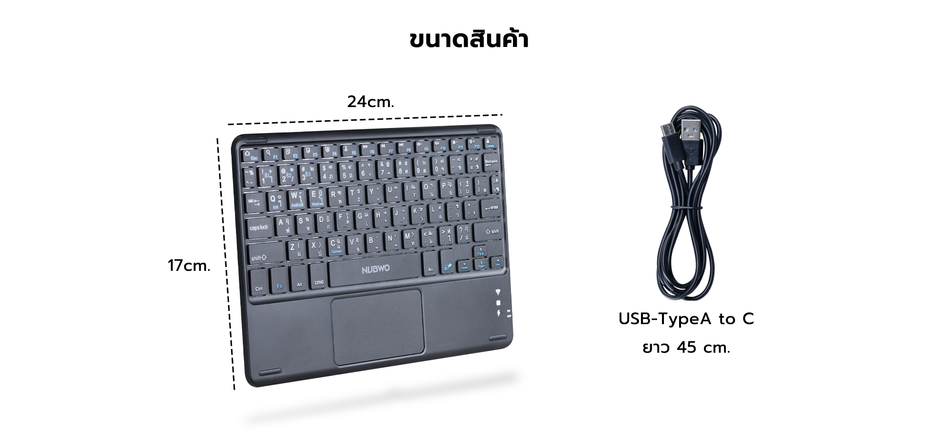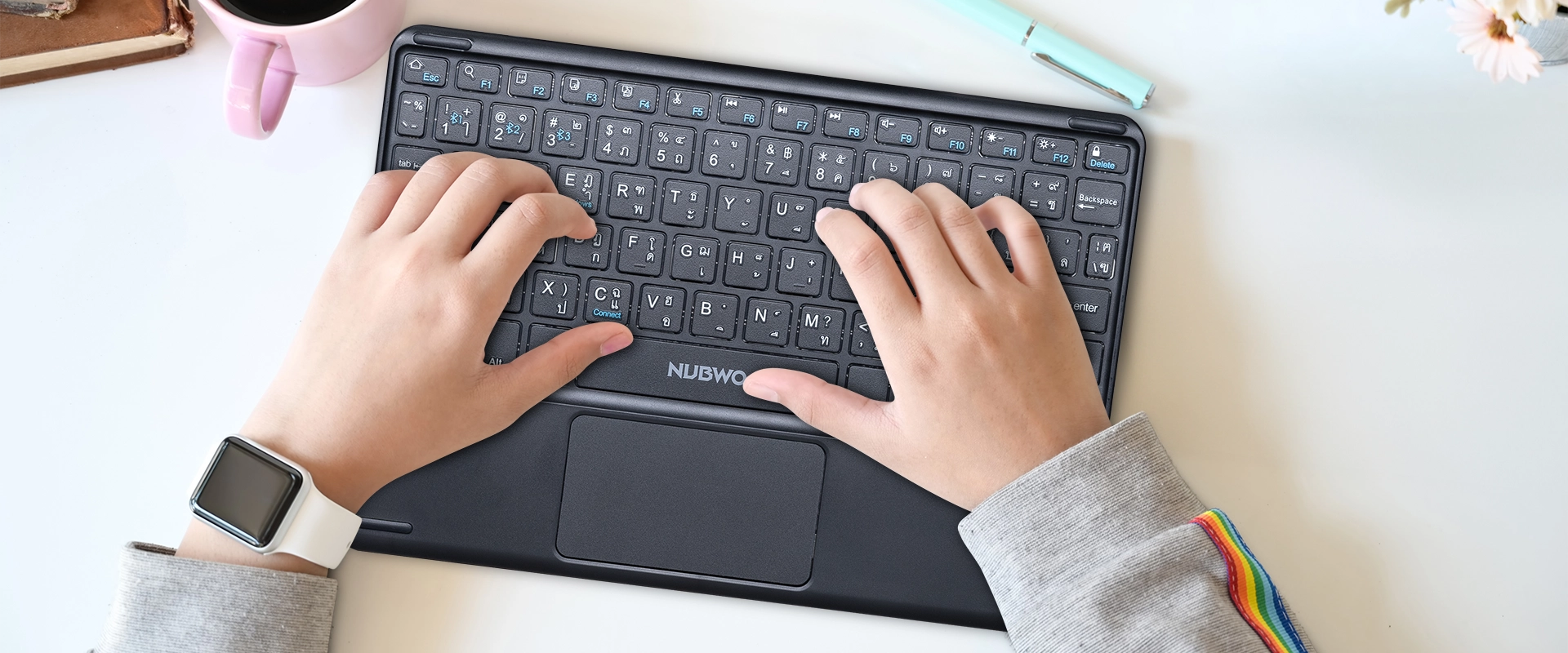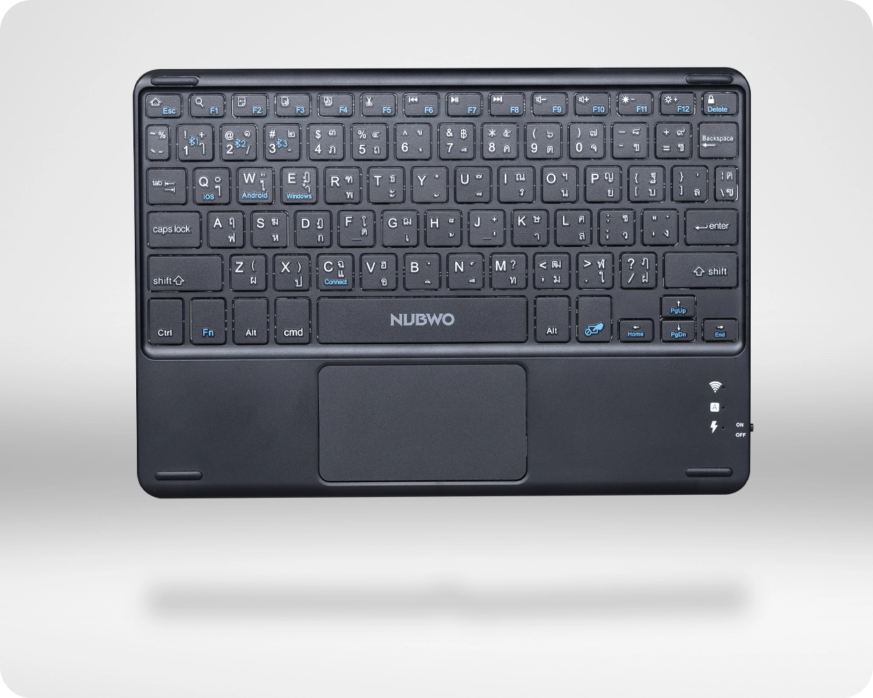 คีย์บอร์ดไร้สาย รุ่น NKB109 ควบคุมง่ายแค่ปลายนิ้วด้วย Touchpad ที่แม่นยำ จากนับโว เชื่อมต่อง่าย ด้วย BLUETOOTH 3.0/5.0 ระยะเชื่อมต่อ 10 เมตร เชื่อมต่อสูงสุดได้ถึง 3 อุปกรณ์ มีแบตเตอรี่ในตัว แบตเตอรี่ความจุ 100 mAh ใช้งานได้อย่างต่อเนื่อง 40 ชั่วโมง ระยะเวลาในการชาร์จ 1.5 ชั่วโมง