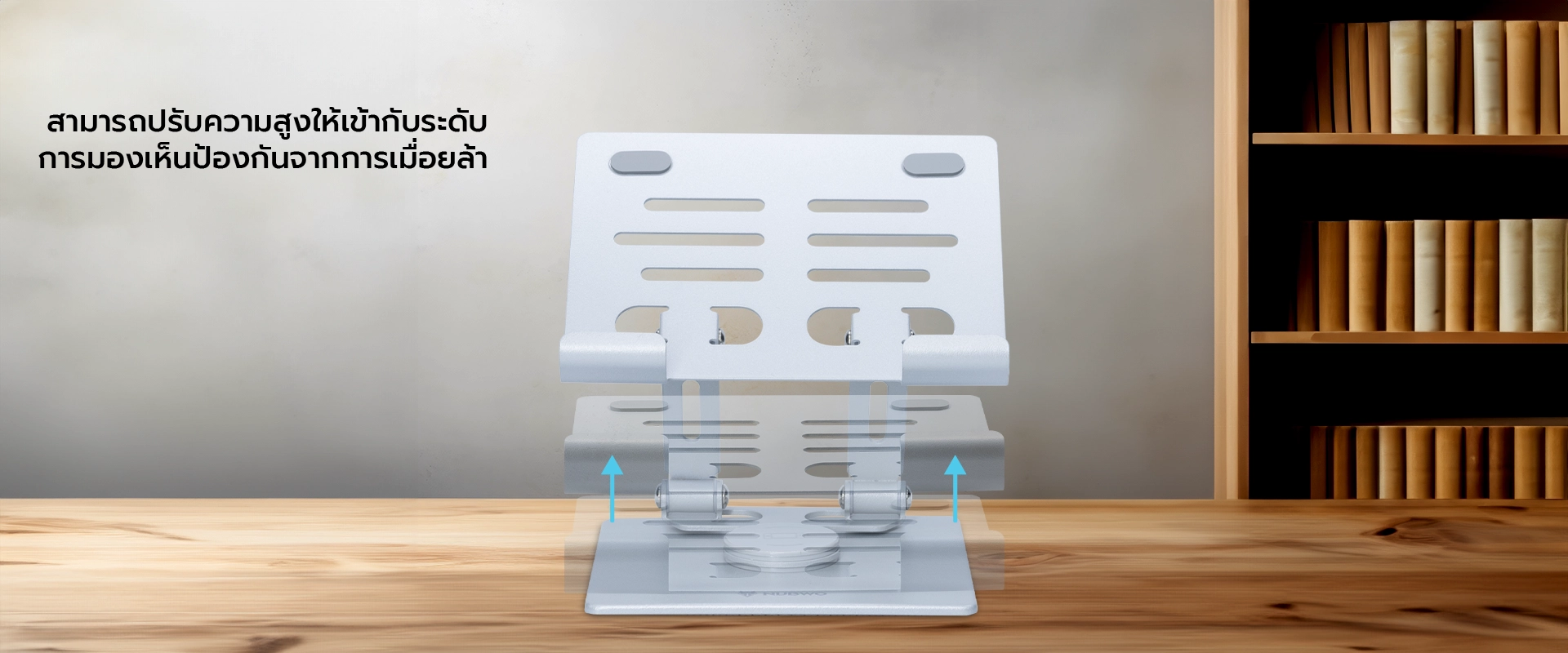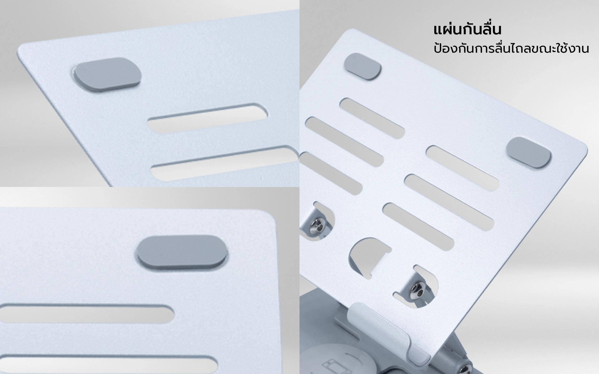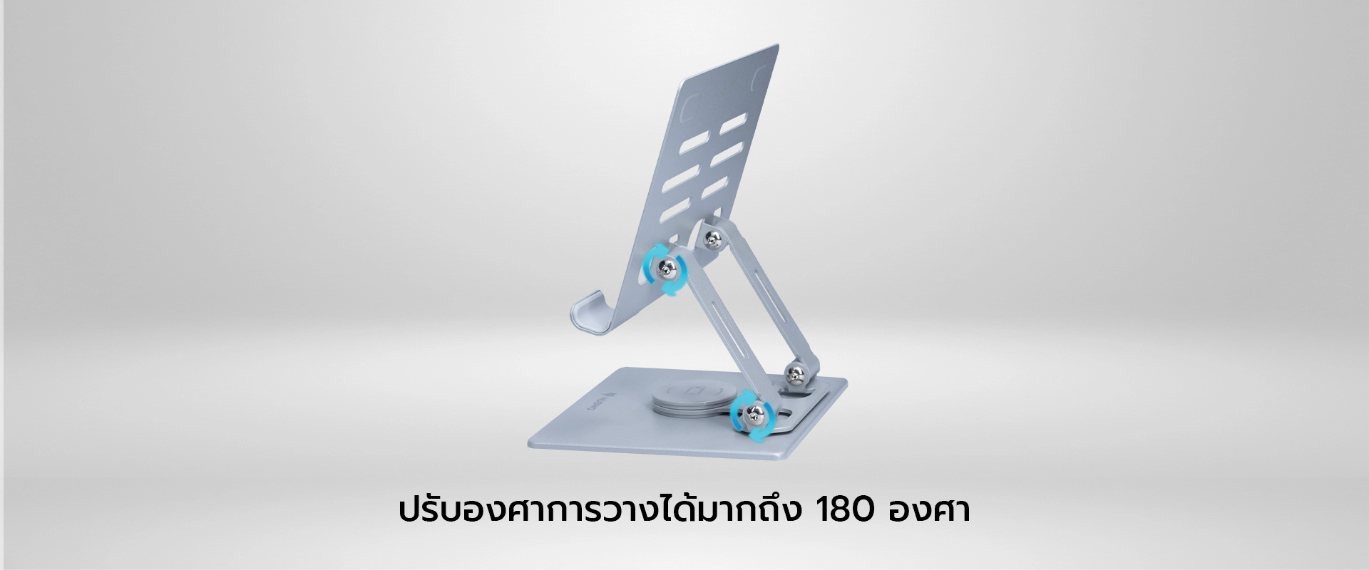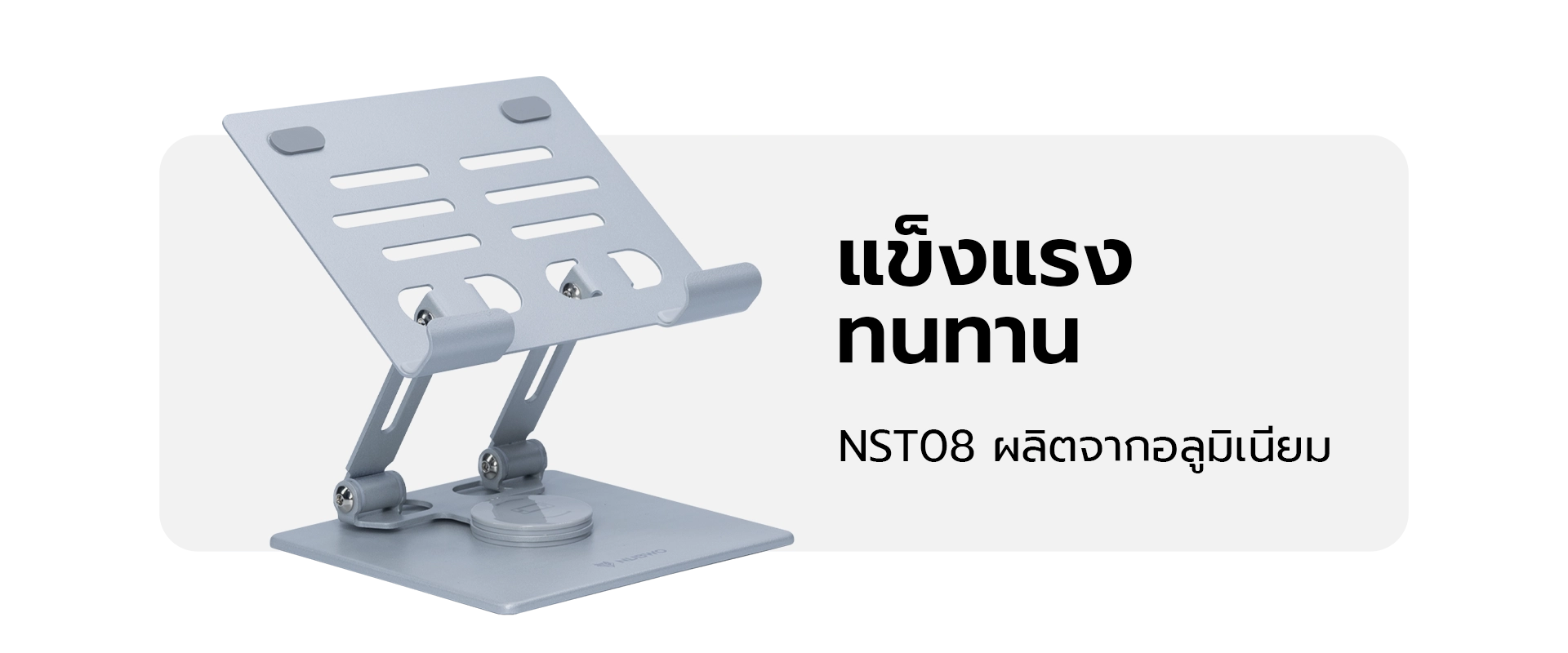 เเท่นวางเเท็บเล็ต รุ่น NST08 มีทั้งหมด 2 สี ดำและเงิน วัสดุเป็น Aluminium ให้ความแข็งแรงและน้ำหนักเบา สามารถพกพาไปได้ทุกที่ การปรับองศาการเงยที่ฐานและที่ตัวจับแท็ปเล็ตได้ถึง 180 องศา มีช่องระบายอากาศ มียางกันรอยเพื่อป้องกันรอยขีดข่วน และยางกันลื่นที่ฐาน รองรับแท็ปเล็ตตั้งแต่ขนาด 4.6-7.5 นิ้ว