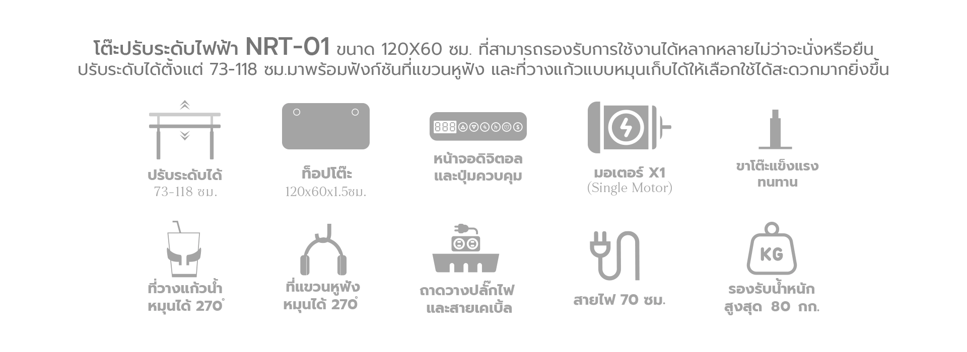 โต๊ะปรับระดับไฟฟ้า รุ่น NRT-01 มี 2 สี สีดำและสีขาว ส่วนหน้า Top ของโต๊ะเคลือบเมลามีน MFC โต๊ะสามารถปรับระดับได้ ด้วยระบบไฟฟ้า ปรับได้สูงตั้งแต่ 73-118 cm. มีแผงควบคุมเป็นระบบดิจิตอล มีที่แขวนหูฟังและที่วางแก้วน้ำ โต๊ะรองรับน้ำหนักได้ถึง 80 กิโลกรัม